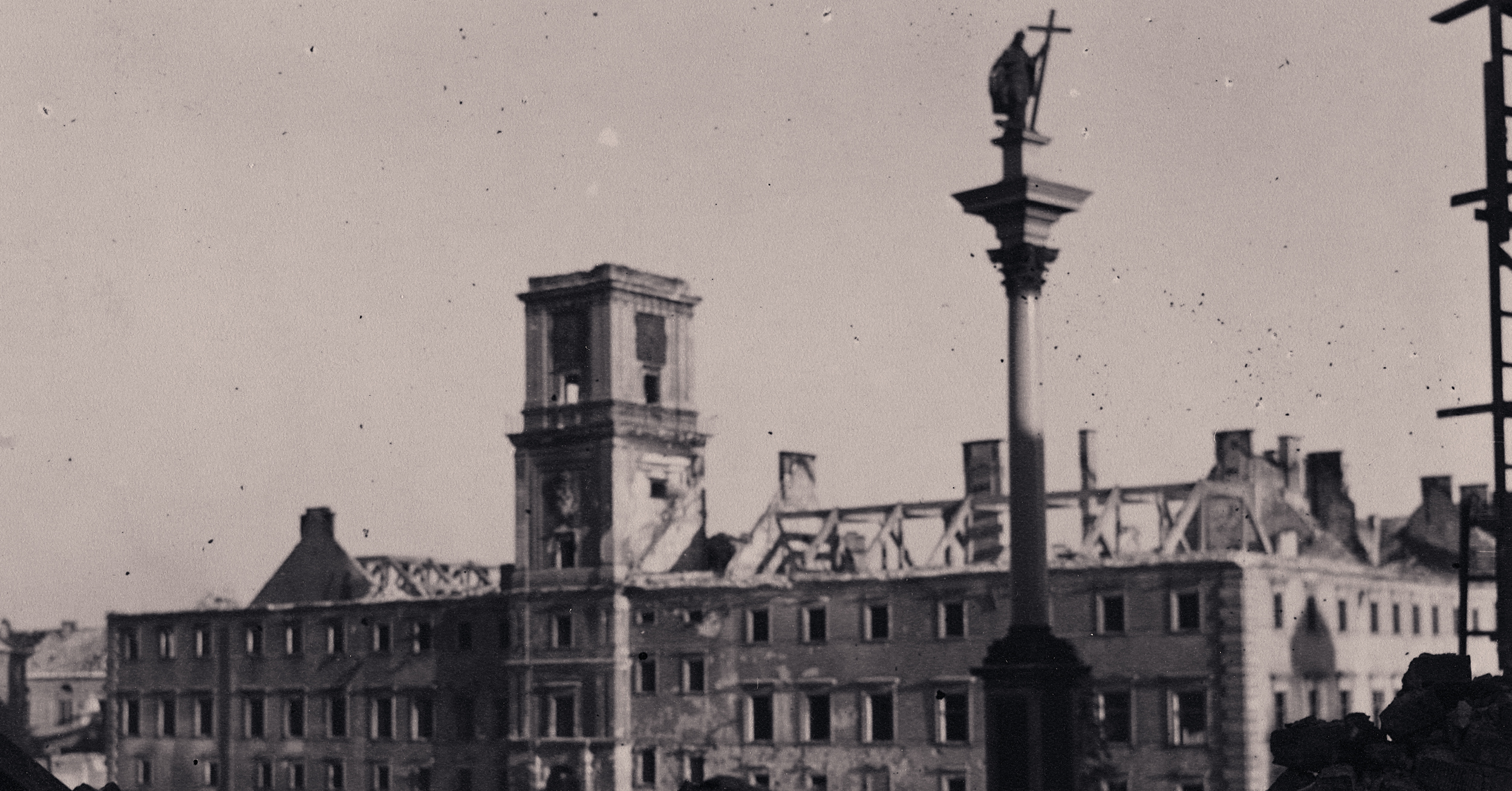 Zdjęcie: Zniszczony Zamek Królewski i Kolumna Zygmunta III Wazy, Jan Ryś, pocztówka, zbiory Muzeum Warszawy